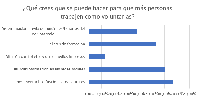A la hora de atraer a jóvenes al voluntariado, al preguntarles en la encuesta qué hacer para acercarse a ellos, su respuesta ha sido la realización de talleres de formación en voluntariado (53,12%). Esto demuestra que los jóvenes ven el voluntariado a cierta distancia de ellos y que para llegar a las asociaciones ven necesario recibir una formación. Por eso es importante hacer un esfuerzo desde las asociaciones para acercarse a los jóvenes, haciéndoles más fácil atraerlos.