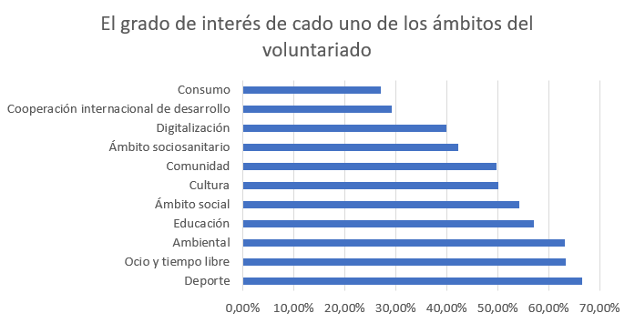 Según la encuesta que hemos sacado adelante, hay sectores en los que la juventud está más interesada que en otros. Para la obtención de los siguientes datos se han tenido en cuenta los valores 4 y 5 de cada escala del 1-5. Así, los intereses de la juventud quedarían como sigue: 1.- Deporte (66,59%), 2.- Ocio (63,38%), 3.- Medio Ambiente (63,09%), 4.- Educación (57,17%), 5.- Ámbito social (54,31%), 6.- Cultura (50,22%), 7.- Comunidad (49,77%), 8.- Ámbito sociosanitario (42,23%), 9.- Digitalización (40%), 10.- Desarrollo Internacional (29,15%), 11.- Consumo (27,06%).