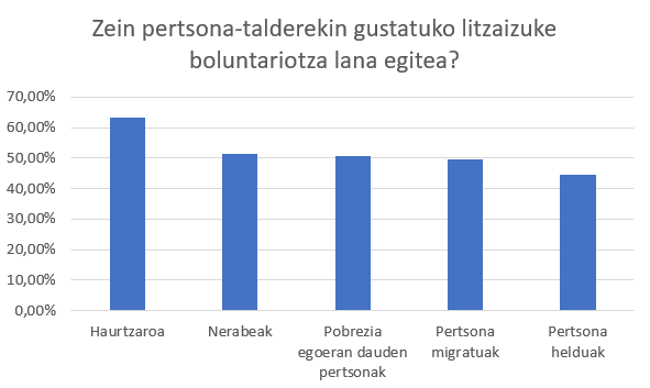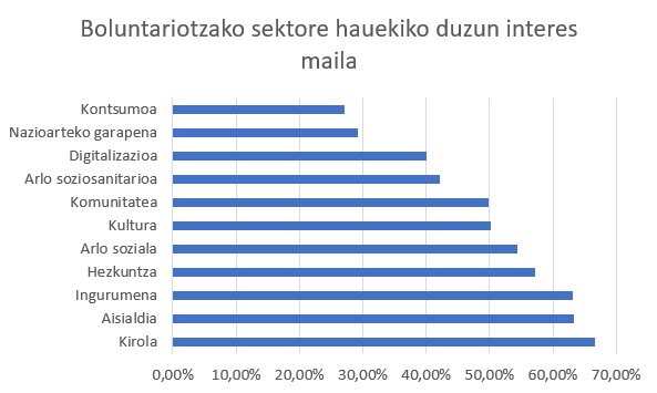 Guk aurrera ateratako inkestaren arabera gazteak sektore batzuetan beste batzuetan baino interes handiagoa daukate. Hurrengo datu hauek ateratzeko 1-5 eko eskala 4 eta 5 balioak hartu dira kontutan. Hori horrela izanik, gazteen interesak horrela geldituko lirateke: 1.- Kirola (%66,59), 2.- Aisialdia (%63,38), 3.- Ingurumena (%63,09), 4.- Hezkuntza (%57,17), 5.- Arlo soziala (%54,31), 6.- Kultura (%50,22), 7.- Komunitatea (%49,77), 8.- Arlo soziosanitarioa (%42,23), 9.- Digitalizazioa (%40), 10.- Naziaorteko Garapena (%29,15), 11.- Kontsumoa (%27,06).