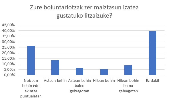 Bestalde, boluntariotzaren maiztasunari begiratzen badiogu gaur egungo gazteetatik inoiz boluntariotzarik egin ez duen pertsonen artean %39,7 -a ez dago ziur, ze maiztasunekin gustatuko litzaioken boluntariotza ekintzetan parte hartzea. %26,9 -ak berriz noizean behin edo ekintza puntualetan partea hartzea gustatuko litzaiokeela adierazi du. %13,7- ak bere parte hartze maiztasuna astean behinekoa izatea gustatuko litzaiokeela adierazi du. %8,7-ak berriz, bere partea hartzea maiztasuna hilean behin baino gehiagotan ikusten duela adierazi du. %6,2 -ak bere buruaren parte hartze maiztasuna astean behin baino gehiagotan izatea gustatuko litzaiokela adierazi du. Azkenik, gazteen %5,4 -ak hilean behineko parte hartze maiztasuna izatea gustatuko litzaiokeela adierazi du.